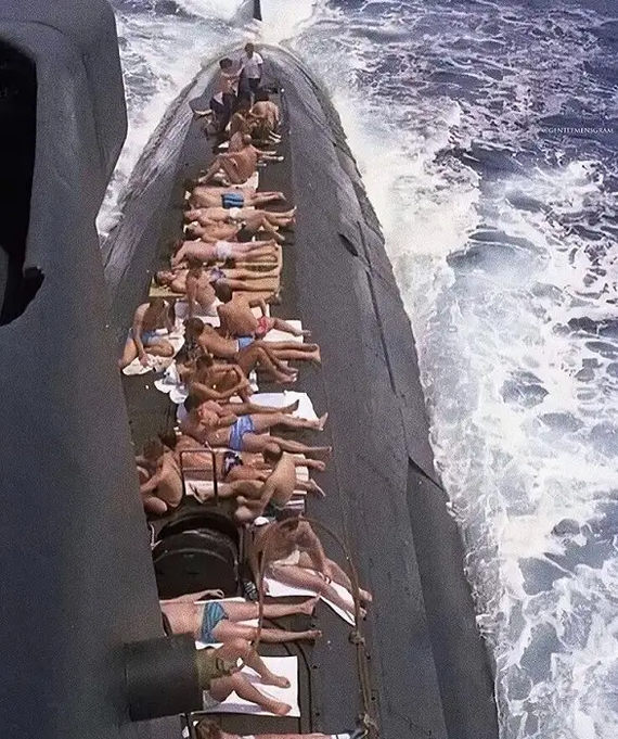 Если судить по другим фотографиям, то иногда при всплытии подводникам командир разрешает поплавать в море, позагорать на поверхности подлодки или даже пожарить колбаски. Всё для поддержания эмоционального комфорта