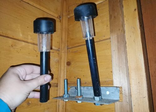 В итоге мне удалось узнать, что это один из элементов системы освещения туалета. В этой системе все очень-очень просто. Состоит она из уголков – держателей и солнечных светильников-карандашей, которые помещаются на болты, вкрученные кверху ногами в уголки.