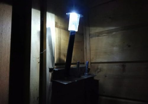 Система очень проста. Шесть фонарей все время находится на улице и заряжаются. Когда идешь в туалет, то с собой берешь пару фонарей, и после берешь их обратно с собой и ставишь снова заряжаться.