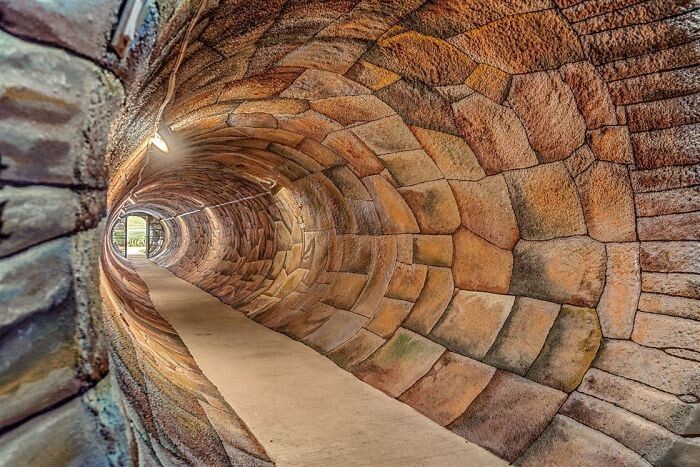 А вот теперь начинается путешествие в нору хоббита! Вход стилизован под туннель, сложенный из больших каменных глыб