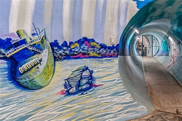 Надземная часть выполнена в виде купола и раскрашена под лесную чащу