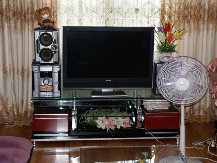 Более современный интерьер гостиной, уже с плоским телевизором в квартире жителя столичного Пхеньяна.