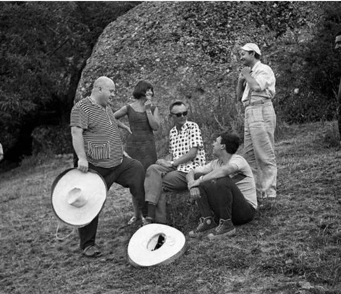 Вот на этом снимке мы видим съёмочную группу кинокартины «Кавказская пленница». Посередине сидит режиссер Гайдай, а вокруг него стоят актеры.