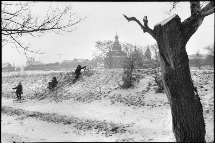 50 лет назад в Суздале. Дети катаются с горки на санках: