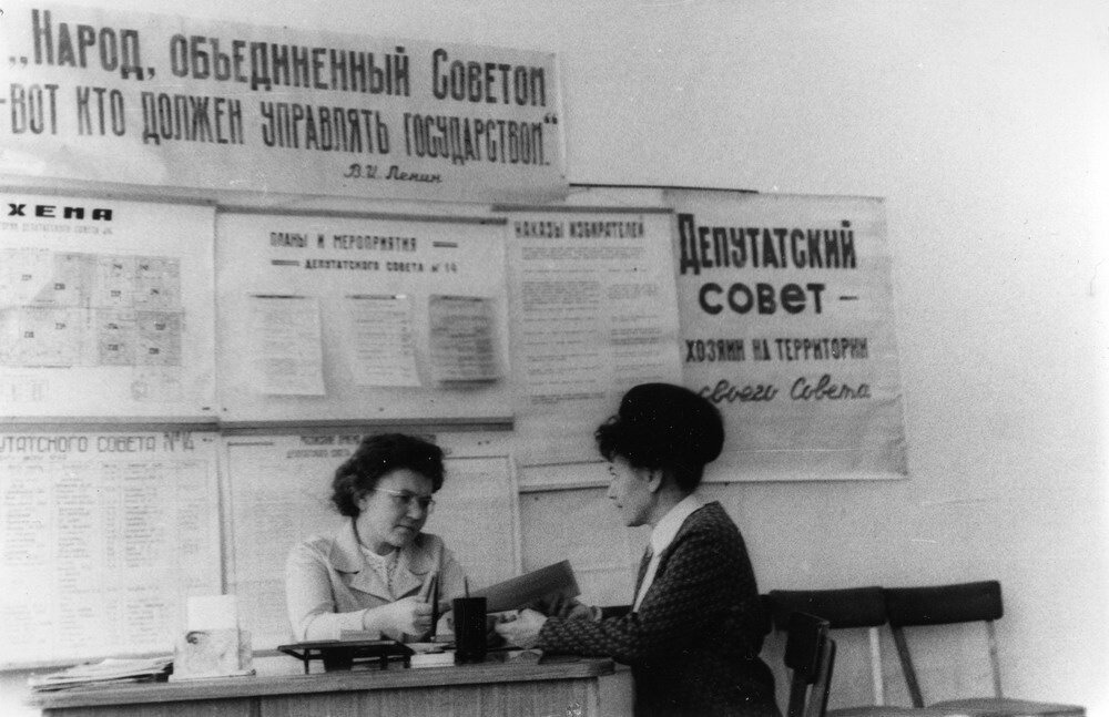 Депутат Куйбышевского райсовета принимает посетительницу. Фото, на мой взгляд, постановочное, сделано для местной газеты.