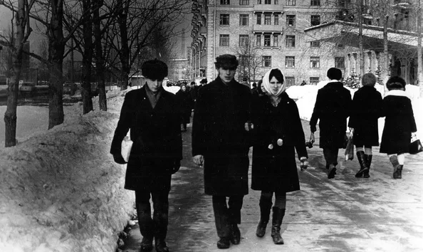 На Профсоюзной улице в Москве. Вот такая тогда была зимняя мода: