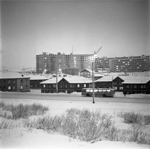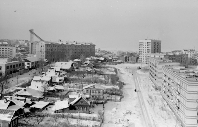 Пермь в январе 1972 года. Знакомые для многих городов контрасты старого и нового — настоящее противостояние одноэтажных кварталов и надвигающихся на них новостроек.