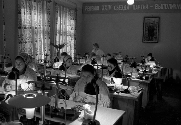 В 1972 году в цеху калининградского янтарного комбината. Лозунг на стене напоминает о планах девятой пятилетки.