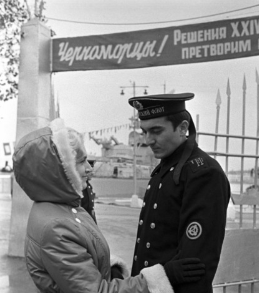Фото сделано 50 лет назад для архива РИА — девушка провожает своего жениха-моряка в очередной рейс.