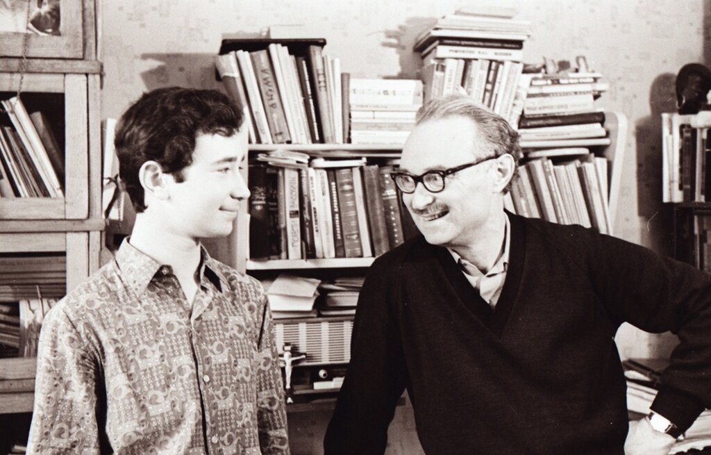 Писатель Самуил Ефимович Полетаев с сыном, фото сделано 8 января 1972 года. Снимок сделан в его доме. Сколько книг — для всех даже места нет, стоят горочками.