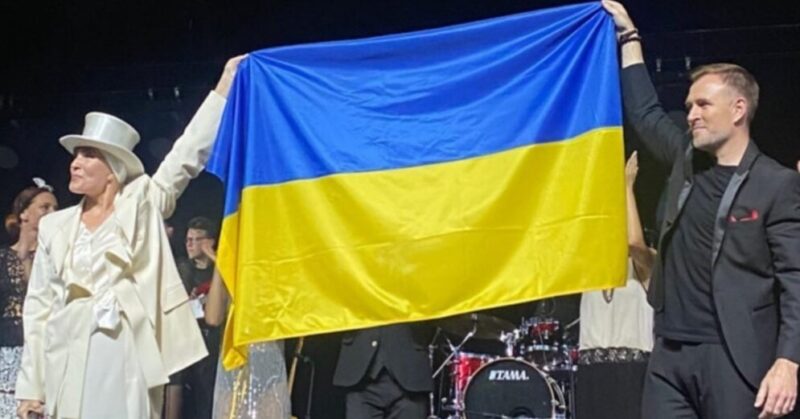 Выступая с концертом в Литве, певица вынесла на сцену флаг Украины. Развернуть стяг ей помог музыкант