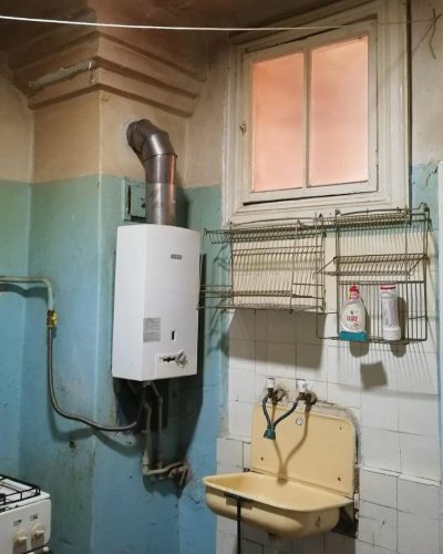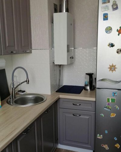 Смеситель на кухне заслуживает особой “похвалы”. Он двойной, выглядит такое приспособление очень нелепо. Еще одна странность – отопительные батареи. Они располагаются одна выше другой. Причем одна из батарей расположена выше кухонного стола. Это максимально странно и нелепо выглядит.