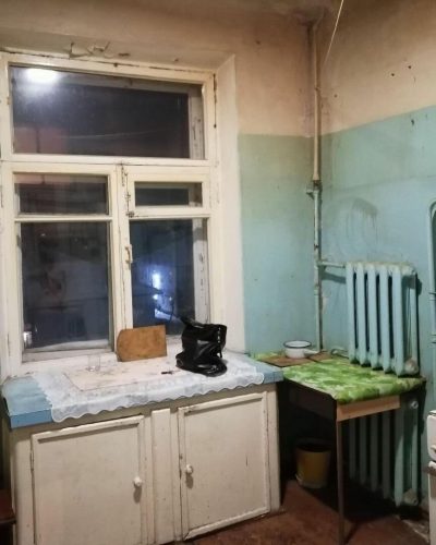 Это фото мы сделали на тот момент, когда стена еще была соединена с ванной комнатой. Можно увидеть, что кухня была в плачевном состоянии: “убитая” раковина, старые металлические решетки для посуды, кафель советсткого образца. Было заметно, что ремонт тут делали еще во времена Советского Союза.