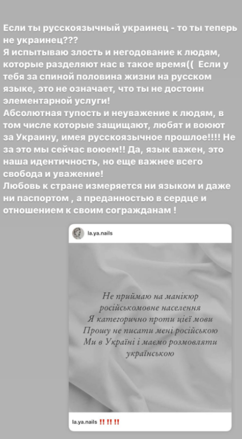 В качестве примера Ксения выложила скрин с аккаунта одной львовской маникюрши. Та натянула белое пальто и не желает общаться с теми, кто не говорит по-украински. Хотят общения на русском — пусть на ногти в Россию едут.