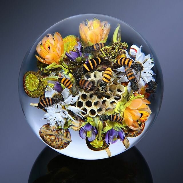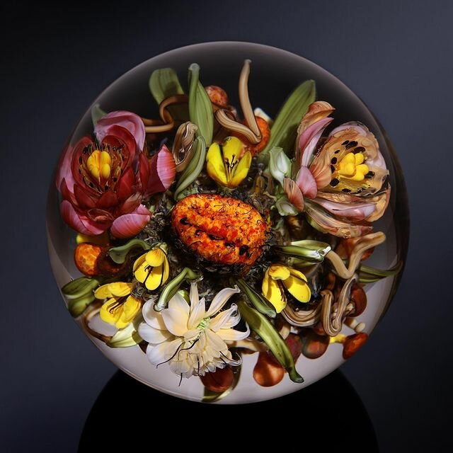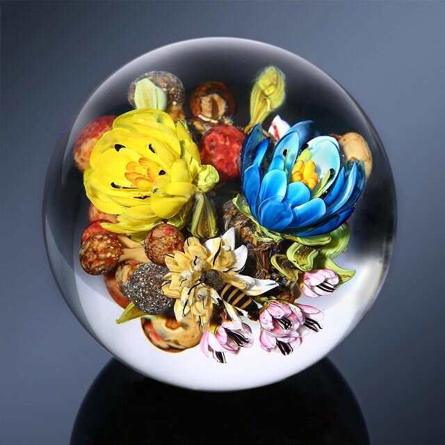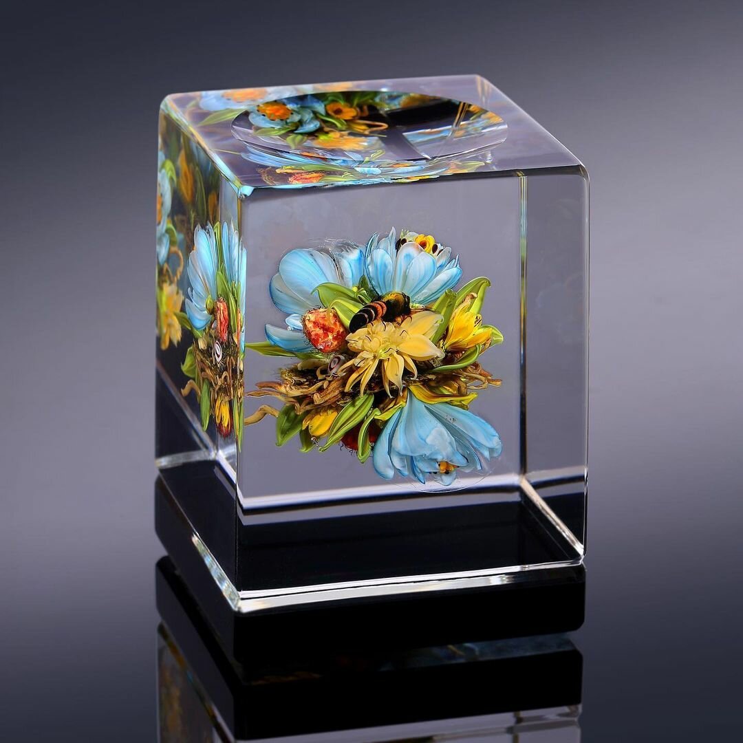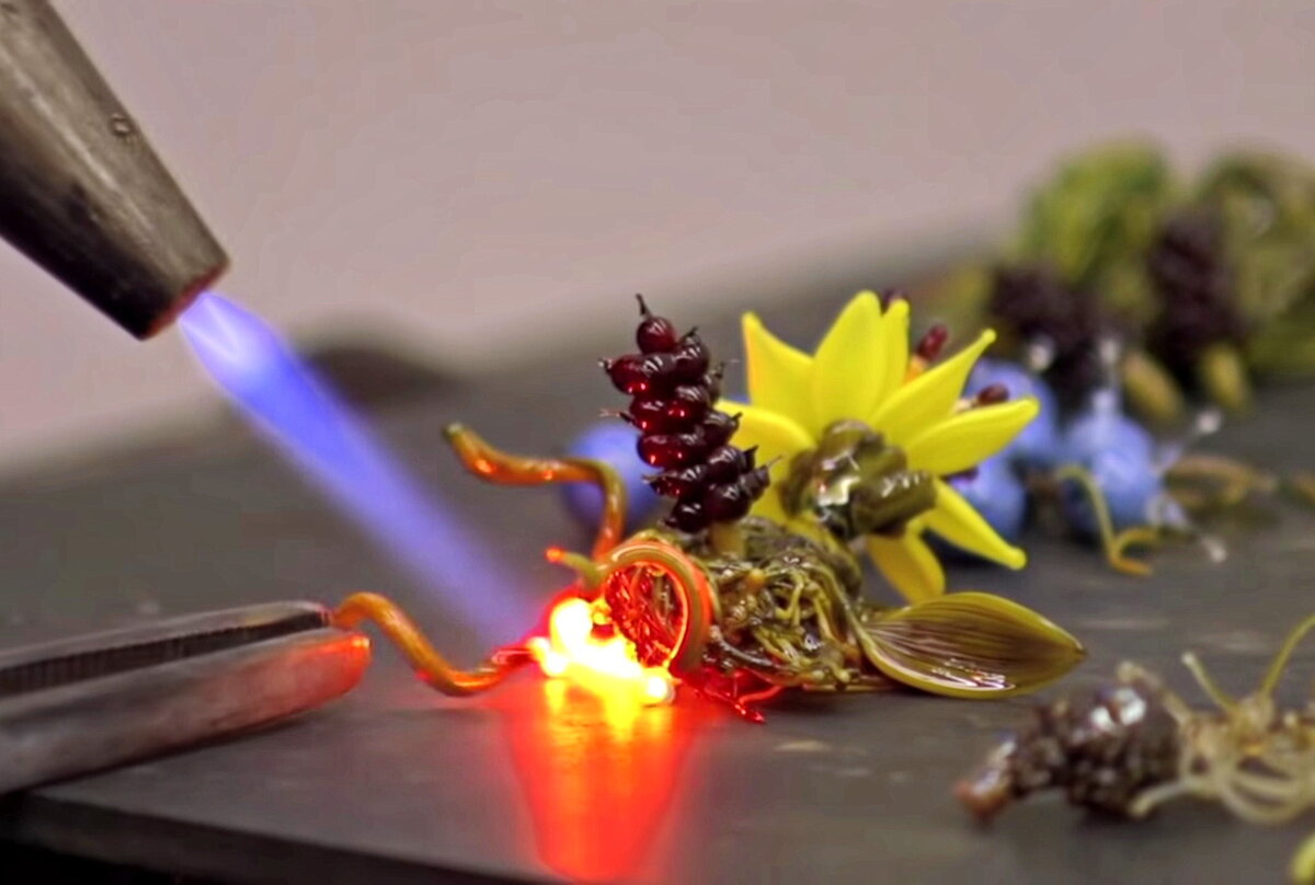 Многие до сих пор уверены, что Пол нашёл способ заливать настоящие цветы в стекло. Но на самом деле в его работах нет ни грамма органики. Это сложнейшая титаническая работа над раскалённой массой, на каждую работу уходит не один день упорного труда.
