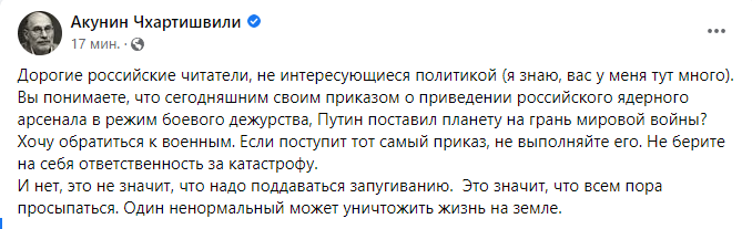 «Дорогие российские читатели, не интересующиеся политикой (я знаю, вас у меня здесь много). Вы понимаете, что сегодняшним своим приказом о приведении российского ядерного арсенала в режим боевого дежурства Путин поставил планету на грань мировой войны?