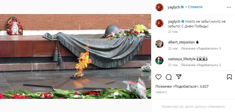 Это был второй пост Яглыча в соцсетях с 24 февраля. До этого он поздравлял подписчиков с 9 мая.