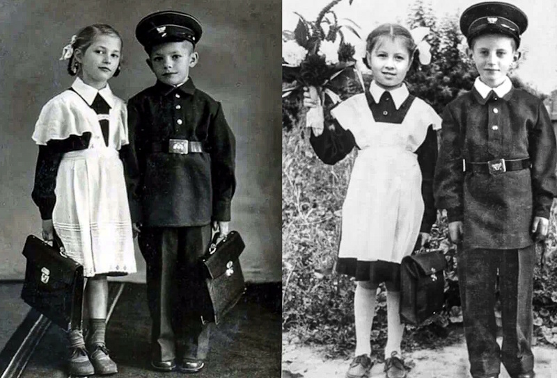 В 1935-1940 годах планировалось внедрить единый стандарт формы для всех школьников СССР. Однако Вторая мировая война помешала этим планам, и только в 1947 году была введена обязательная школьная форма, которая внешне была схожа с дореволюционной. Для мальчиков это были гимнастерка, брюки, ремень и фуражка с эмблемой. Девочкам полагались строгие коричневые платья и черные фартуки, дополненные белыми воротниками и манжетами. Для торжественных случаев был предусмотрен белый фартук. Родители должны были покупать эту форму за свой счет, но она была неудобной: фартуки и рукава быстро пачкались чернилами и не отстирывались. Покупать новую форму было дорого.