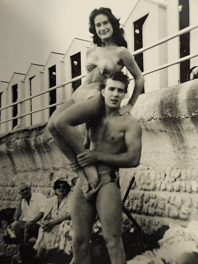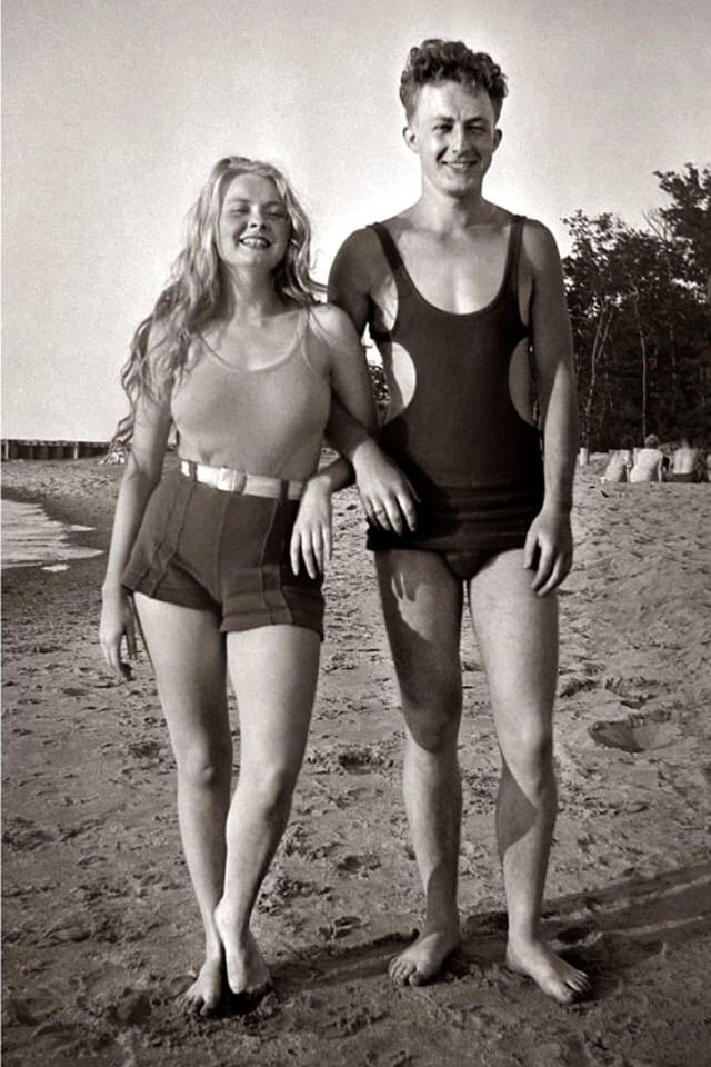 №7 1950-е. Появились раздельные купальники. На этом фото стоит обратить внимание на то, как на резвящуюся молодёжь смотрит пожилая пара на заднем плане!