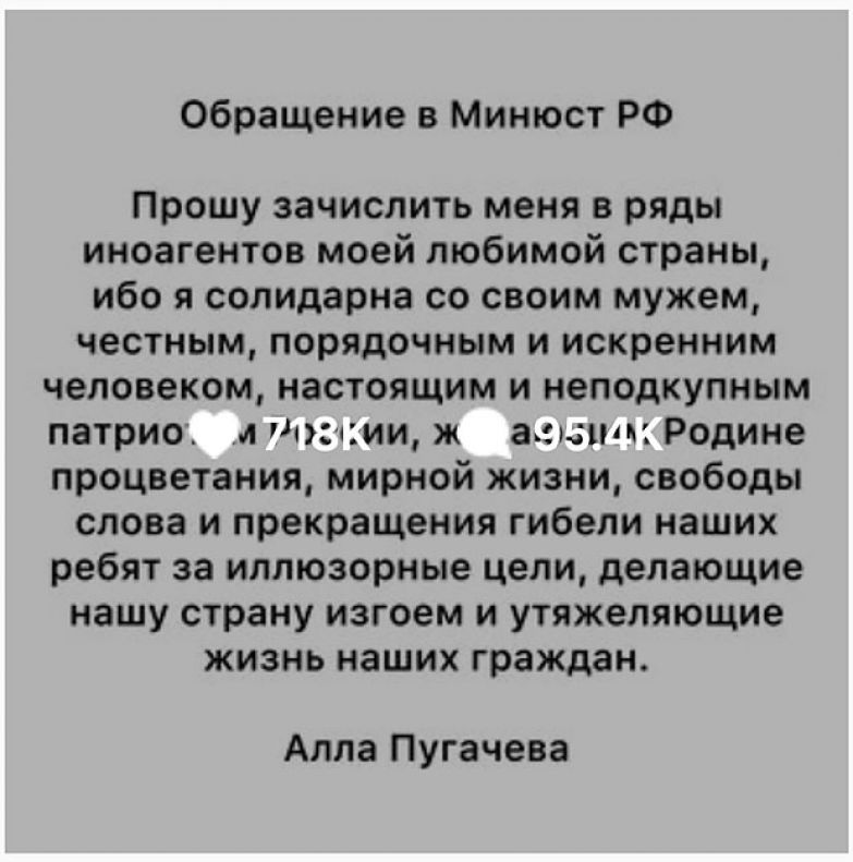 У себя на странице Примадонна написала, что поддерживает своего супруга, а также попросила, чтобы ее вместе с Галкиным внесли в реестры иностранных агентовдействующих в РФ. Также она написала, что российские солдат сейчас гибнут за ели, которые невозможно даже четко сформулировать или понять. За сутки этот пост лайкнуло более 700 тысяч человек.