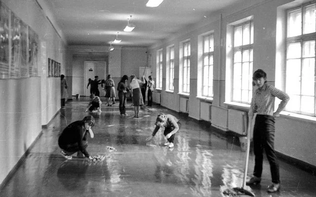 А где же уборщицы? Уборщицы в школах были, но они убирали коридоры и «места общего пользования». Кроме того, в школах иногда проводились субботники, когда каждый класс проводил «большую» уборку с мытьем парт и стен.