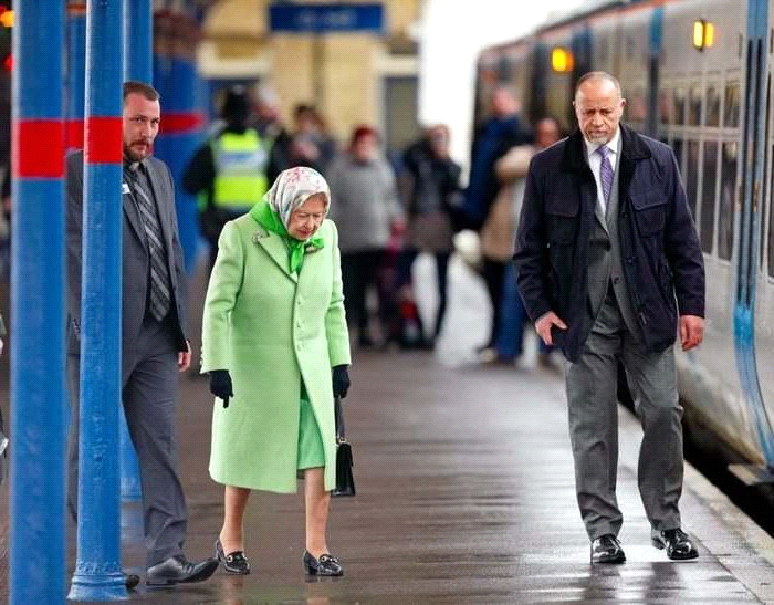 Она спокойно шла по перрону, после села в поезд и отправилась по своим делам. Конечно, у Королевы Великобритании был личный вагон, но никто не оцеплял вокзал, да и её никто не подвозил к вагону с эскортом.