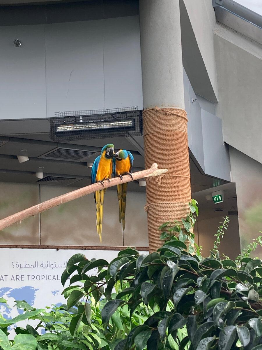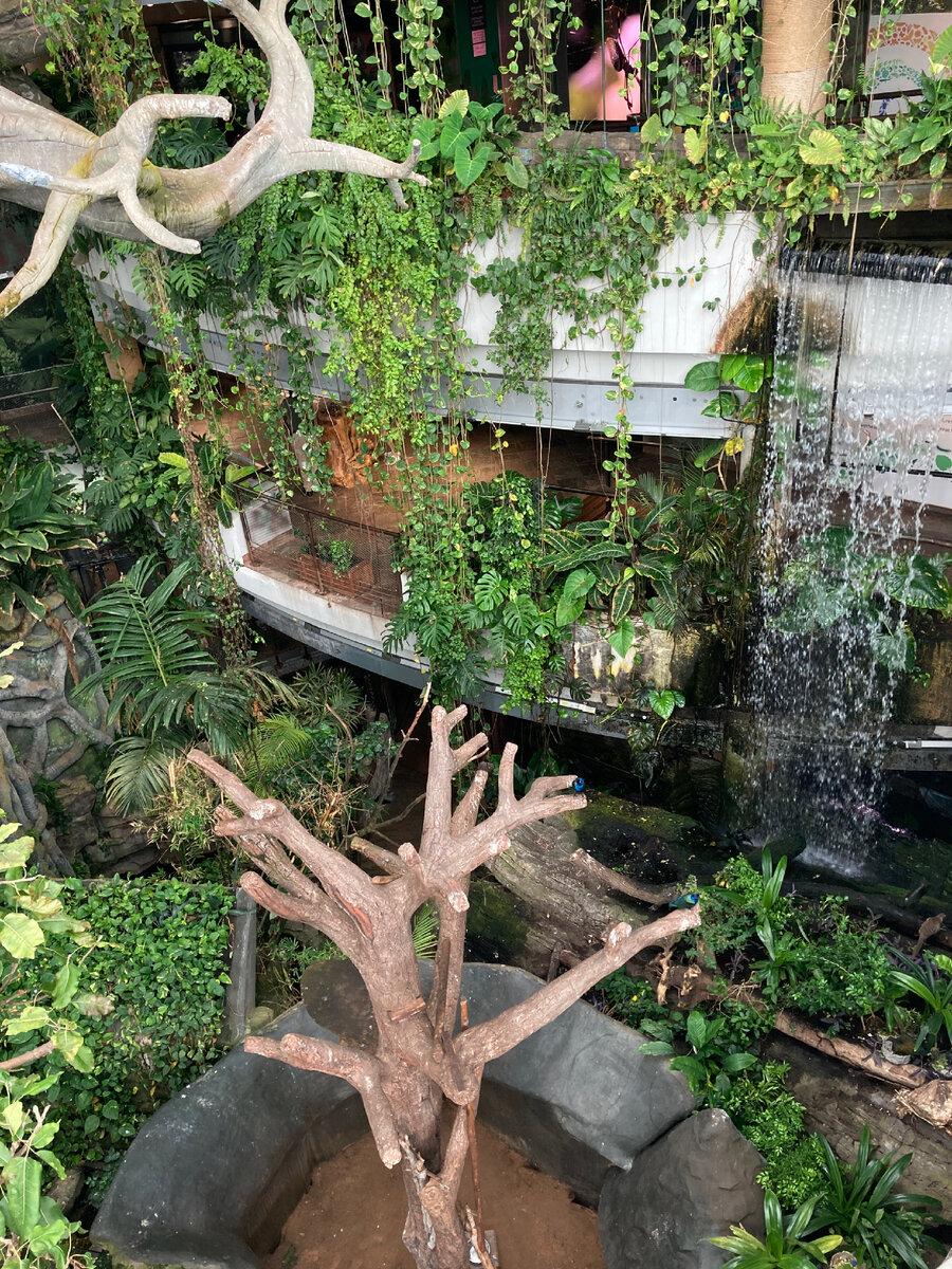Суть такая: оплачиваешь билетик, заходишь в лифт и поднимаешься на четвёртый этаж. Прогулка начинается с самого верха, постепенно спускаешься по лестнице и рассматриваешь диковинных животных. Птицы летают вокруг тебя, могут даже сесть или ущипнуть. Но трогать их нельзя, на каждом шагу стоит строгая охрана. Так что, никакого беспредела, как в наших контактных зоопарках, там нет.