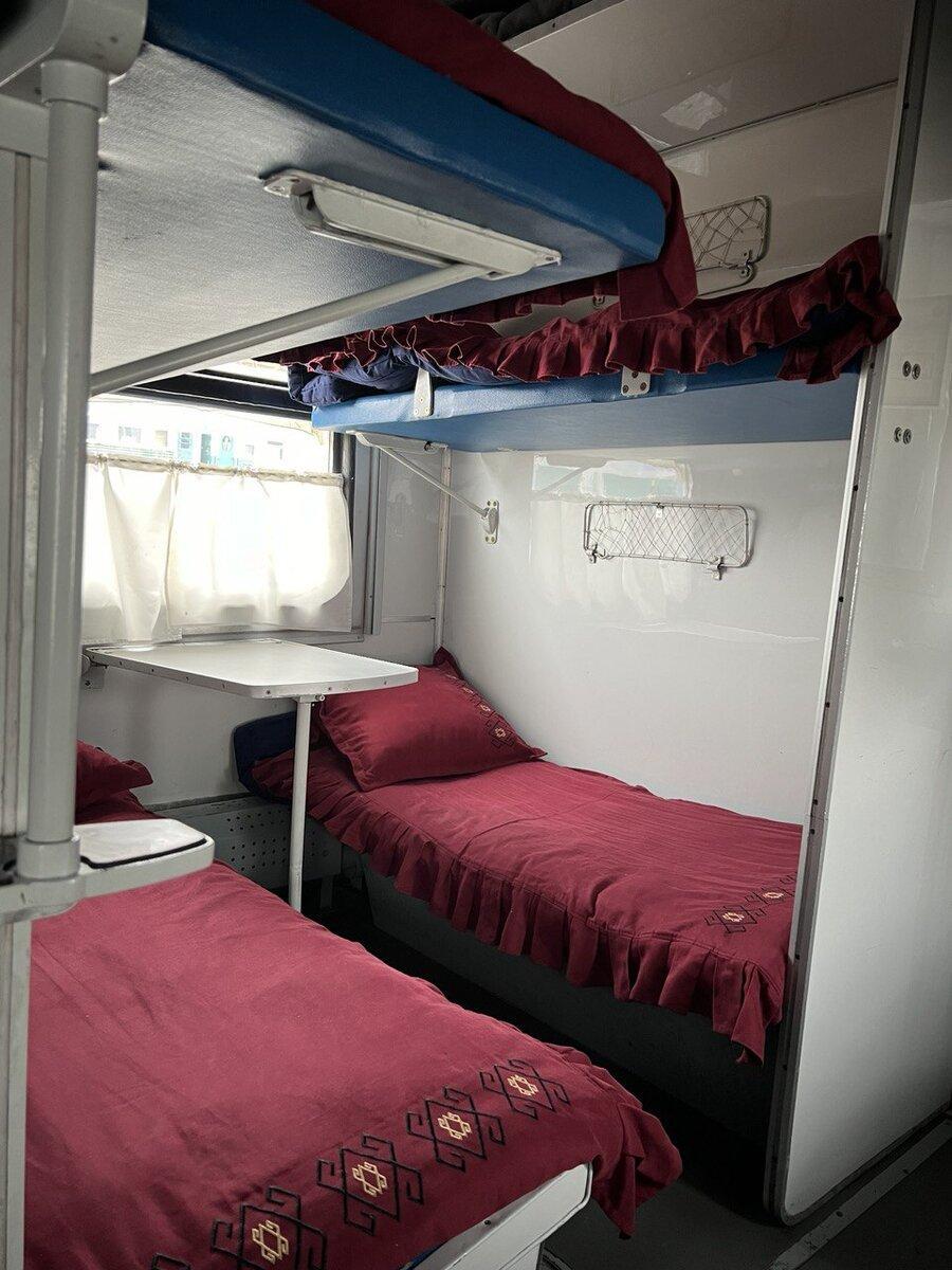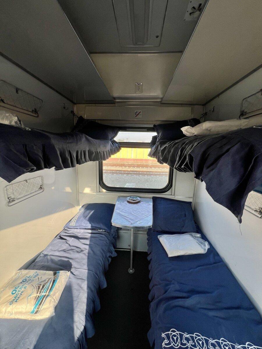 По 4 спальные полки, между которыми есть столики. Есть розетки, но большинство из них нерабочие, к сожалению. Вай фая и точечного освещения нет.