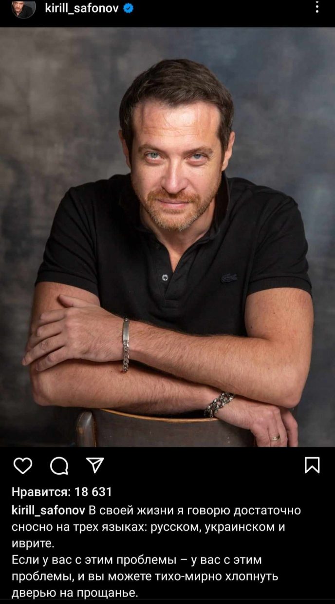 “Я родился в еврейской семье, школьные годы провел во Львове. Я сносно владею 3 языками: украинским, русским и ивритом”,- заявил Сафонов. Актер предложил “хлопнуть дверью” всем недовольным подписчикам.