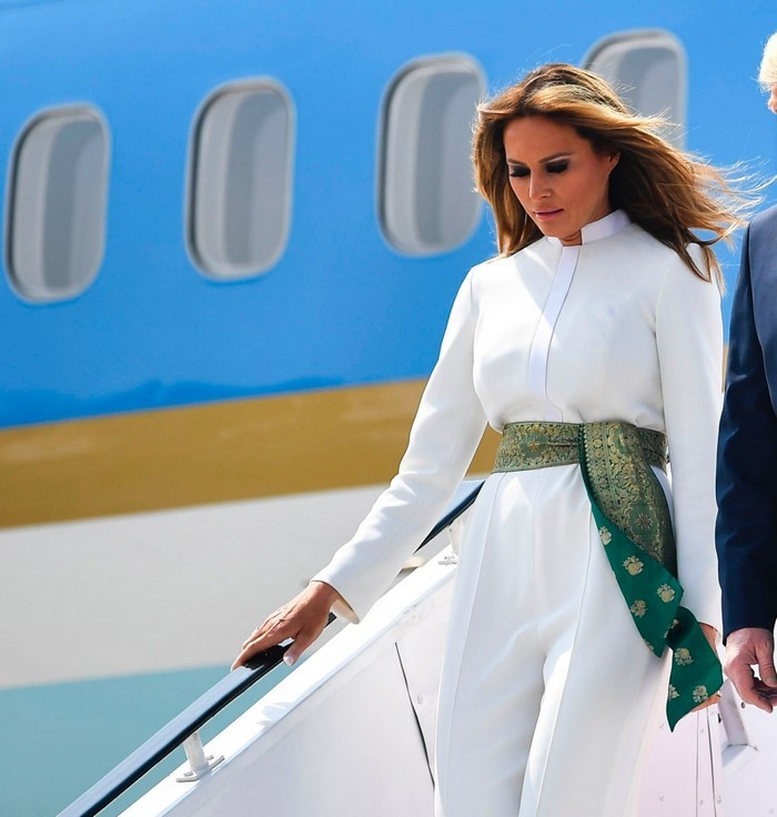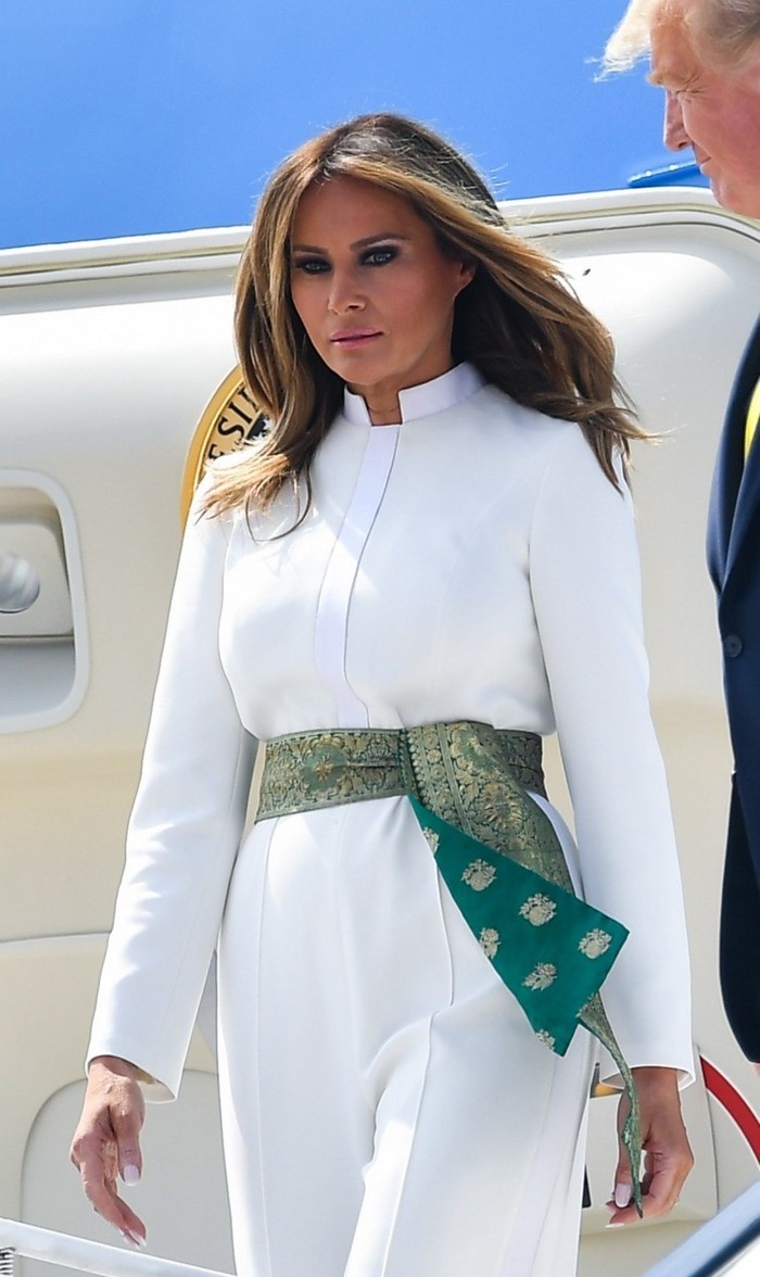 Первая леди США для поездки в Индию выбрала тематический комбинезон белого цвета от Atelier Caito For Herve Pierre и дополнила свой образ поясом из ткани.