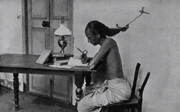 1905 г, индийский студент поздно вечером готовится к сдаче экзаменов в Мадрасском университете в Тамилнаде, а чтобы не уснуть, привязывает волосы к стене.