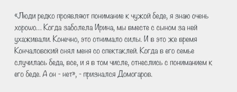 Кроме того, в семье Кончаловского уже много лет произошла другая беда. Его дочь Мария попала в аварию и с того момента находится в коме. Когда произошла вся эта ситуация, то режиссера, по словам Домогарова, поддерживали все, кто мог.