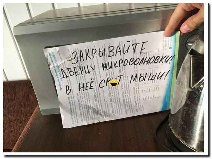 Вероятно микроволновка стоит где-то в офисе, в месте где сотрудники принимают пищу. И похоже случалось так, что один из сотрудников явившись на работу и увидев открытую дверь микроволновки, увидел там сюрприз от маленького мышонка)
