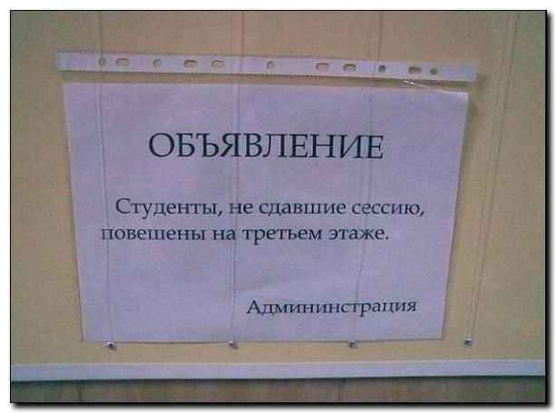«Не сдал сессию, будешь повешен на 3-м этаже!. А если не сдал зачет — будешь изгнан из универа сразу в Ад!)»