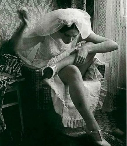 Очаровательная невеста зашивает чулки.