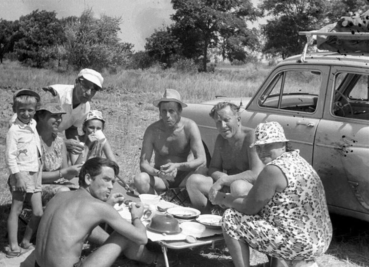 Возможно и сейчас так делают, но раньше было повсеместно. Брали с собой вареную картошку в кастрюлях, компот в трехлитровых банках и прочую снедь. На пледах и покрывалах накрывался стол. Тогда еще не было так много пластика, поэтому тарелки, кружки и стаканы везли с собой из дома, ну и пластиковых столов со стульями тоже не было. Мыли посуду зачастую тоже в реке.