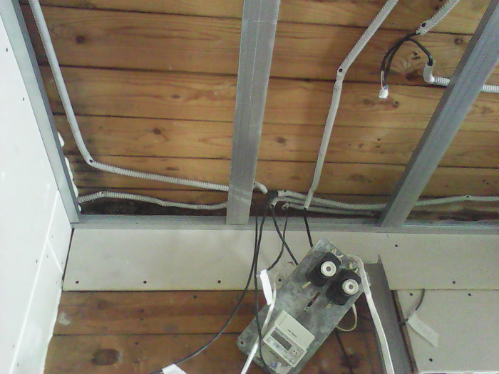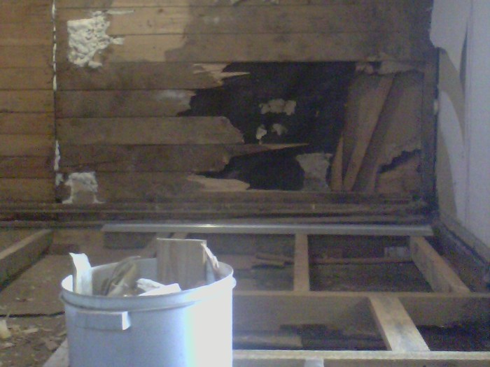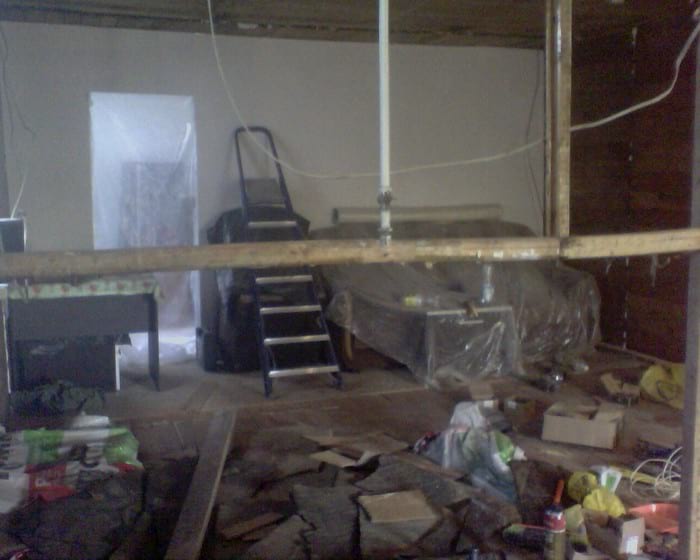 Дожили мы там до весны, подкопили деньжат, и муж начал ремонт. Мы с дочкой перебрались на время к свекрови. Муж перебрал всё: пол, стены, потолок, всё выровнял, утеплил, укрепил, полы сделал из ОСП, стены и потолок обшил гипсокартоном, поменял проводку. Немного фоток процесса (за качество извиняюсь, муж снимал на шуруповёрт)