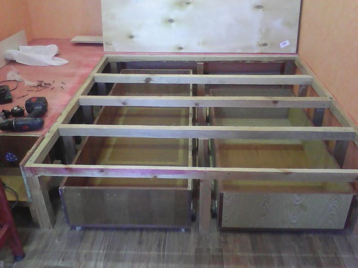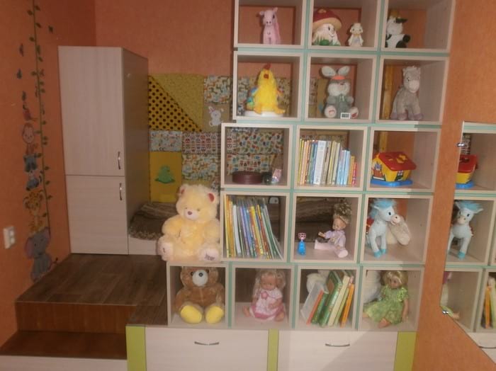 Из-за того что детская узкая, решили сделать подиум. Под ним 2 огромных ящика.