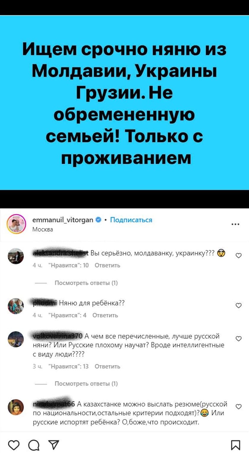 «Ищем срочно няню из Молдавии, Грузии, Украины. Не обремененную семьей! Только с проживанием», – написал Эммануил Гедеонович.