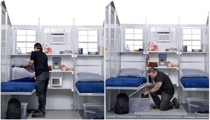 Несмотря на его размер, в нем есть два спальных места, полки для вещей и даже кондиционеры. Дома обогреваются, что позволяет жить в них в любое время года. Туалет, душ и стиральные машины находятся в отдельном общем помещении.