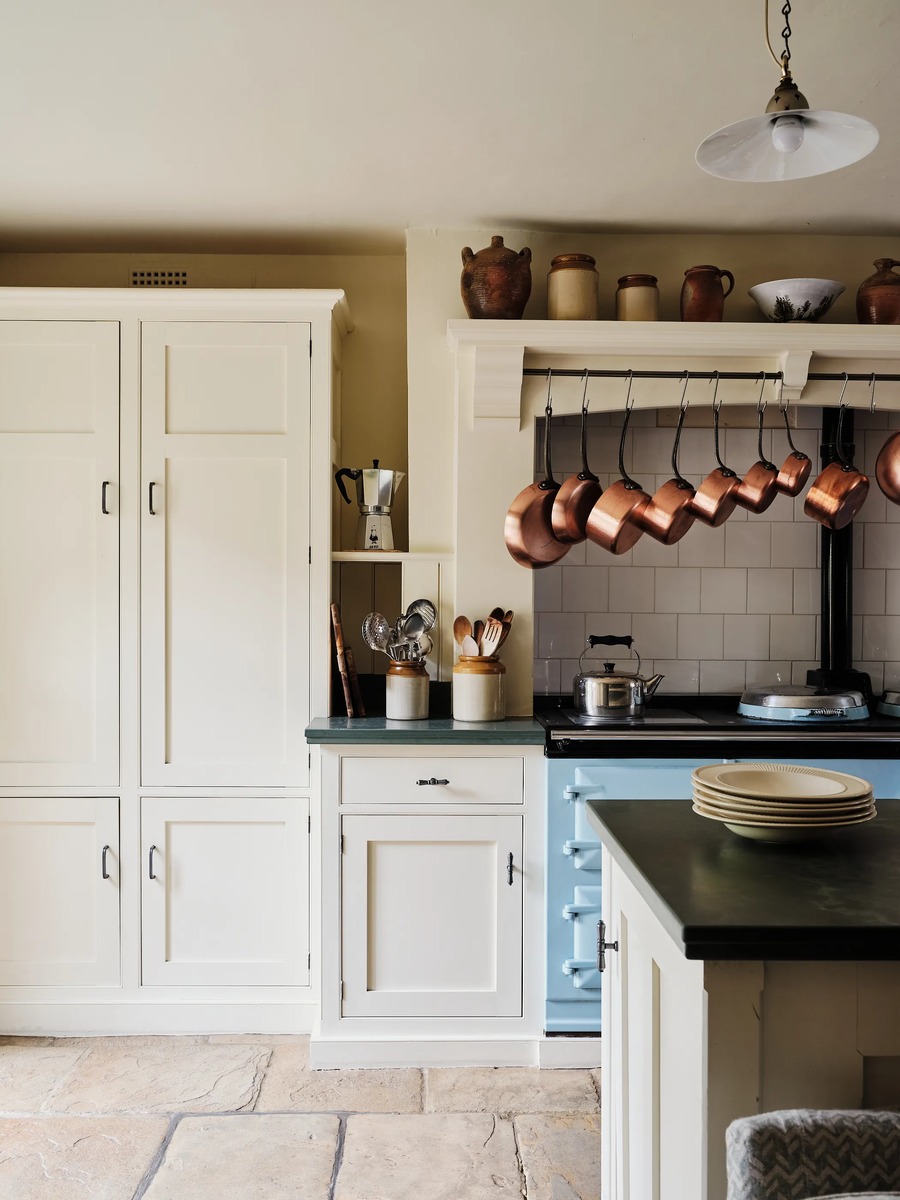 Кухня хоть и кажется слегка современной, но и здесь немало исторических деталей. Например, легендарная печь AGA (ей уже почти сто лет). И коллекция медных ковшиков, сковородок и кастрюль, которые Бланш собирает всю жизнь
