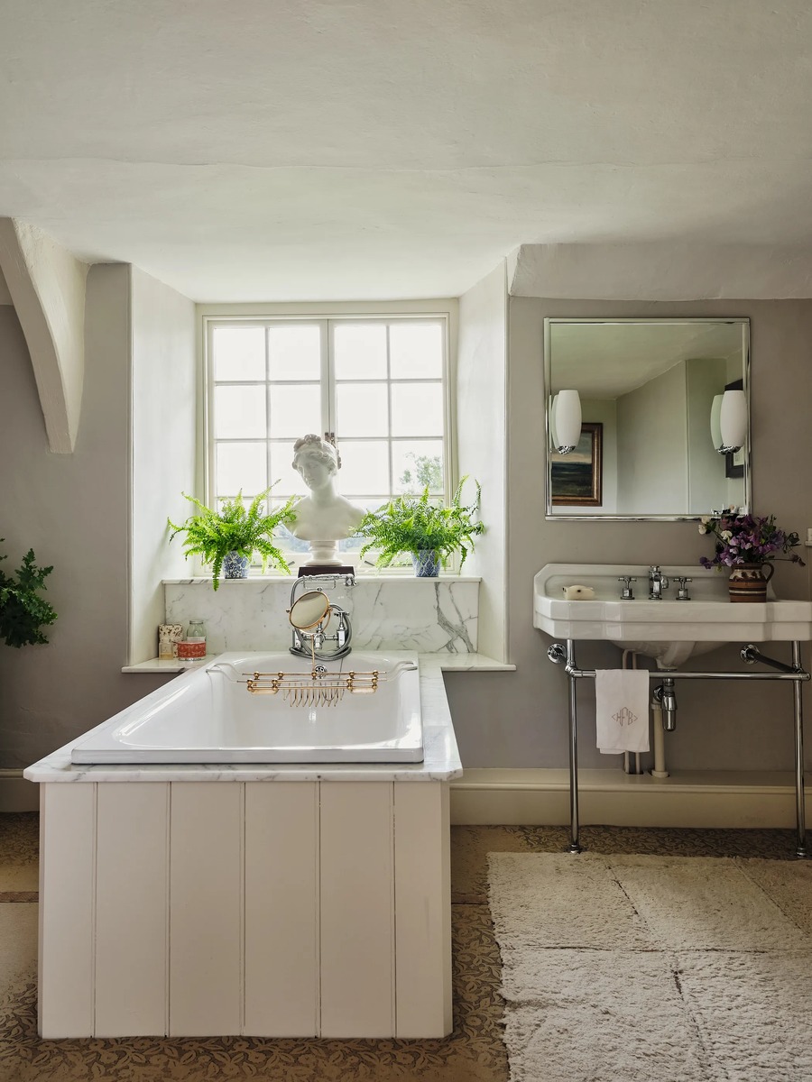 Ванная комната находится на втором этаже, там же, где спальни. Если честно, я бы заменила ванну на какую-нибудь старинную с кованными чугунными лапками