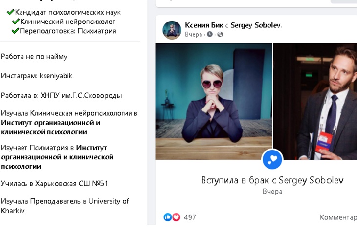Вдова покойного актера Дмитрия Марьянова, который умер в 2017 году, психолог Ксения Бик вышла замуж. Об этом она накануне сообщила на своей странице в Facebook. Ее новым супругом стал журналист Сергей Соболев.