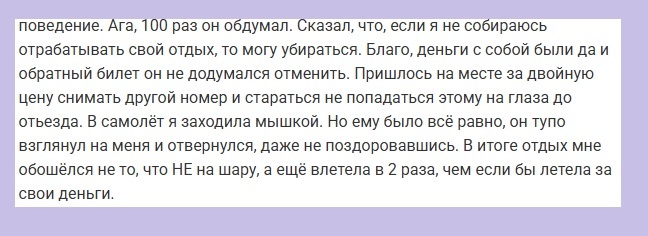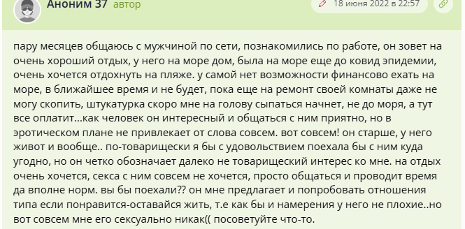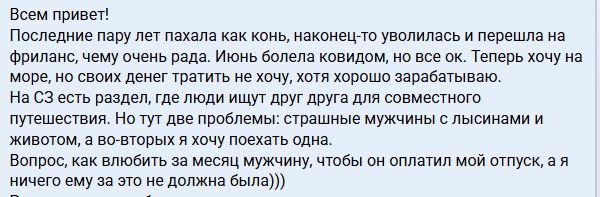 «Девушки, кому интересен взрослый мужчина, возраст чуть за 50, здоров как физически, так и психологически, не женат, кредитами, и детьми не обременен, неплохо зарабатываю, не тусовщик, но могу и сходить потанцевать куда-то. Хотелось бы найти симпатичную, невысокую, стройную, веселую, самое главное адекватную (в меру) девушку от 18 до 35 лет для поездки на море, примерно в конце марта, апреля, или середины мая (по мере нахождения попутчицы, и дату тура определим), расходы беру на себя (но не спонсирую, экскортницы идут лесом)…»