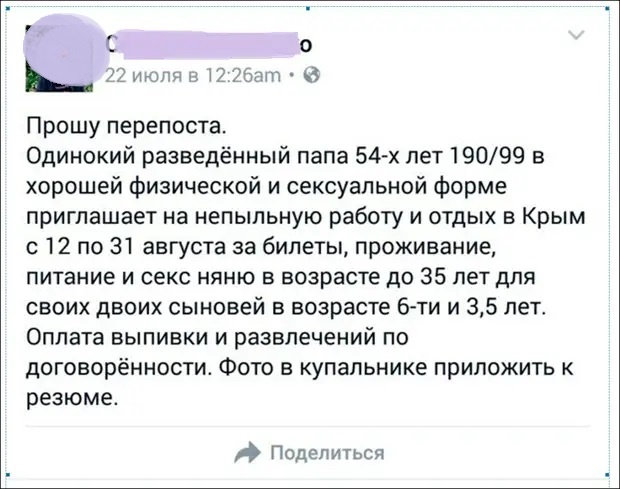 Но это еще нормальный вариант. Пару лет назад по соцсетям разлетелось объявление в котором 54-летний разведенный мужчина искал для своих малышей няню в возрасте до 35 лет на небольшой срок. В обмен на услуги он предлагал оплату дороги, проживания, питание в Крыму. И с*kс!