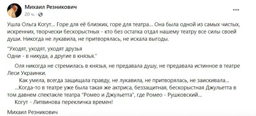 Эту печальную новость общественности сообщил режиссер Михаил Резникович.