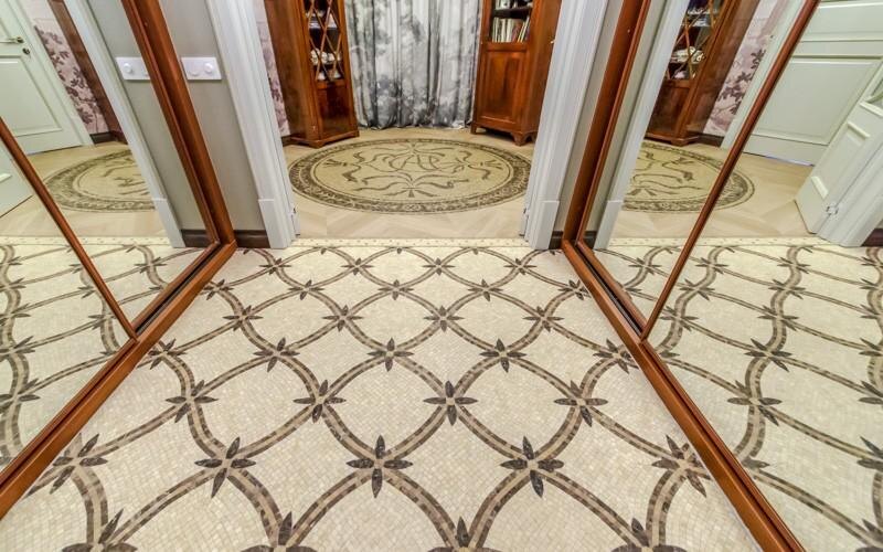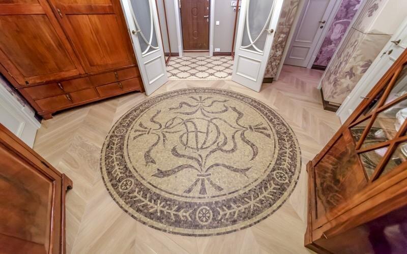 На полу в холле появилась уникальная мозаика с инициалами хозяев — С, Н и А. Эту розетку выкладывали вручную почти три недели.