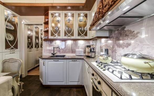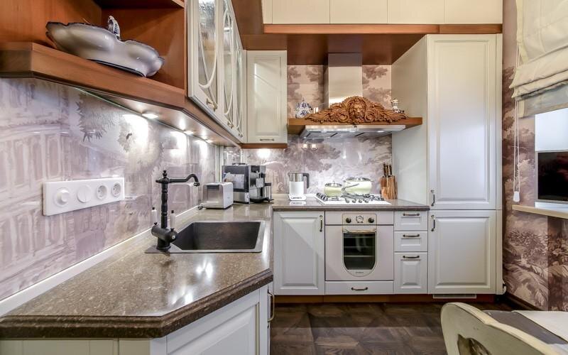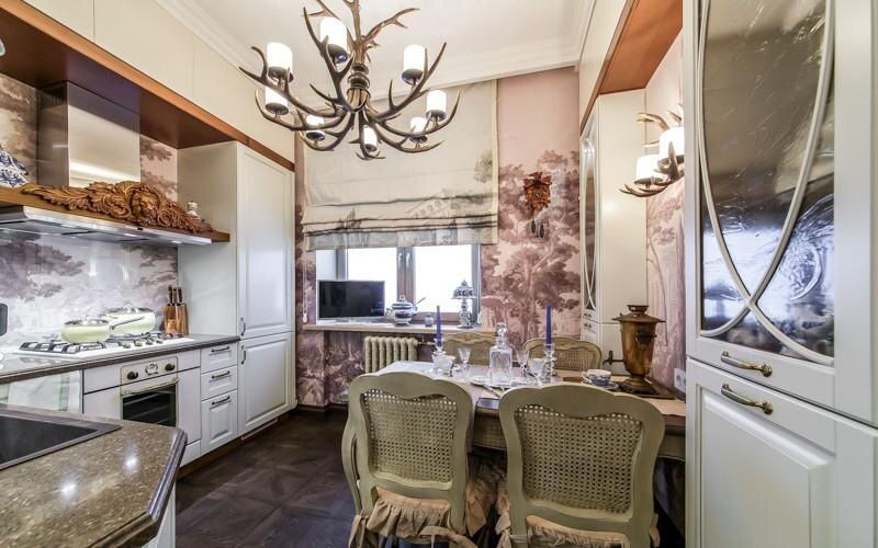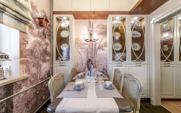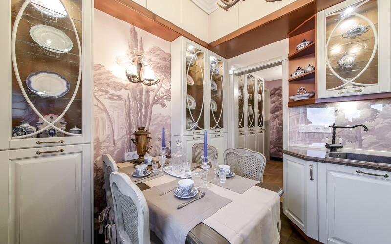Стены оформлены современными фресками. В прихожей фреска отсылает к мотивам французского сада, а на кухне продолжает тему охотничьего домика.