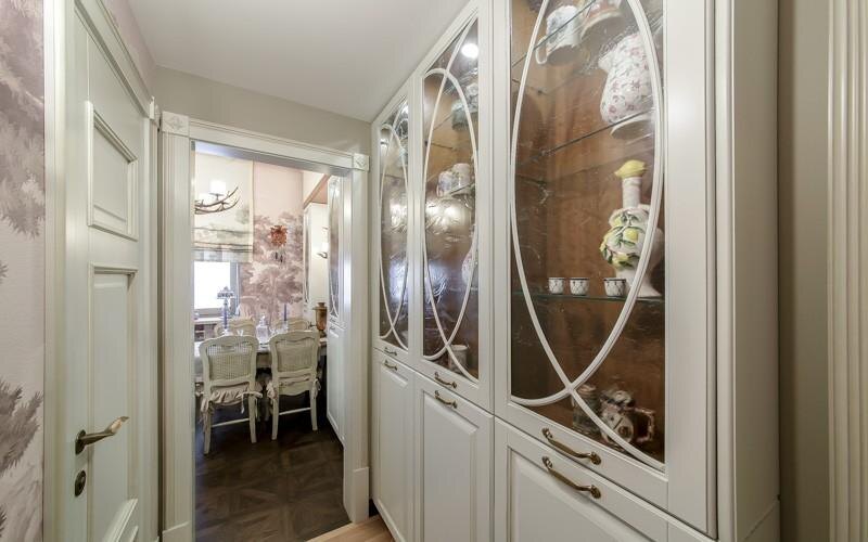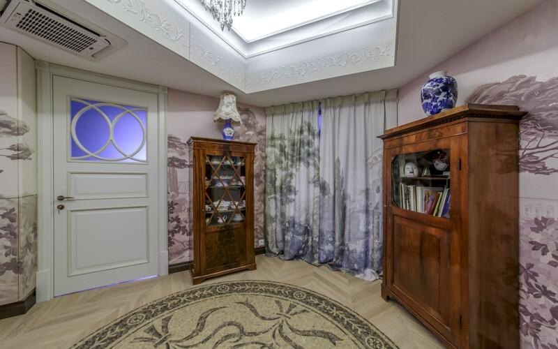 Трёхкомнатная квартира получилась сложной, многослойной и очень «театральной». Здесь много антиквариата, картин, икон, статуэток и старинных часов с боем — всё собиралось годами и имеет свою историю.