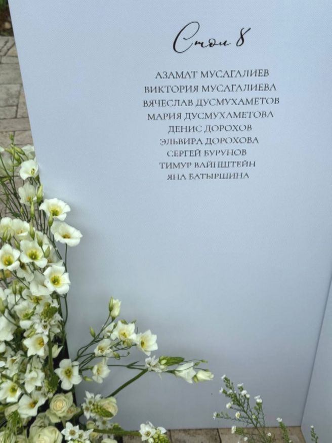 Территорию декорировали живыми белыми цветами – здесь не удастся выбить скидку в сезон. Известные декораторы скидок не делают – их услуги нарасхват, а цветы стоят дорого: не менее двух миллионов рублей за весь декор (хрусталь, свечи, цветы, зелень и т.д.).
